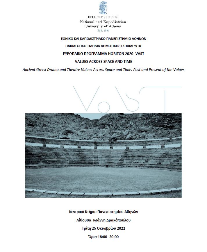 Στις 25 Οκτωβρίου 2022 ημέρα Τρίτη και ώρα 18:00 -20:00, στην αίθουσα Δρακοπούλου στο κεντρικό κτίριο του Πανεπιστημίου Αθηνών θα διεξαχθεί ημερίδα στην οποία θα παρουσιαστούν τα αποτελέσματα της έρευνας Ancient Greek Drama And Theatre Values Across Space And Time. Past And Present που διεξάγει το Πανεπιστήμιο Αθηνών μέσα στα πλαίσια του ευρωπαϊκού προγράμματος Horizon 2020 με τίτλο «Values Across Space and Time” (VAST).